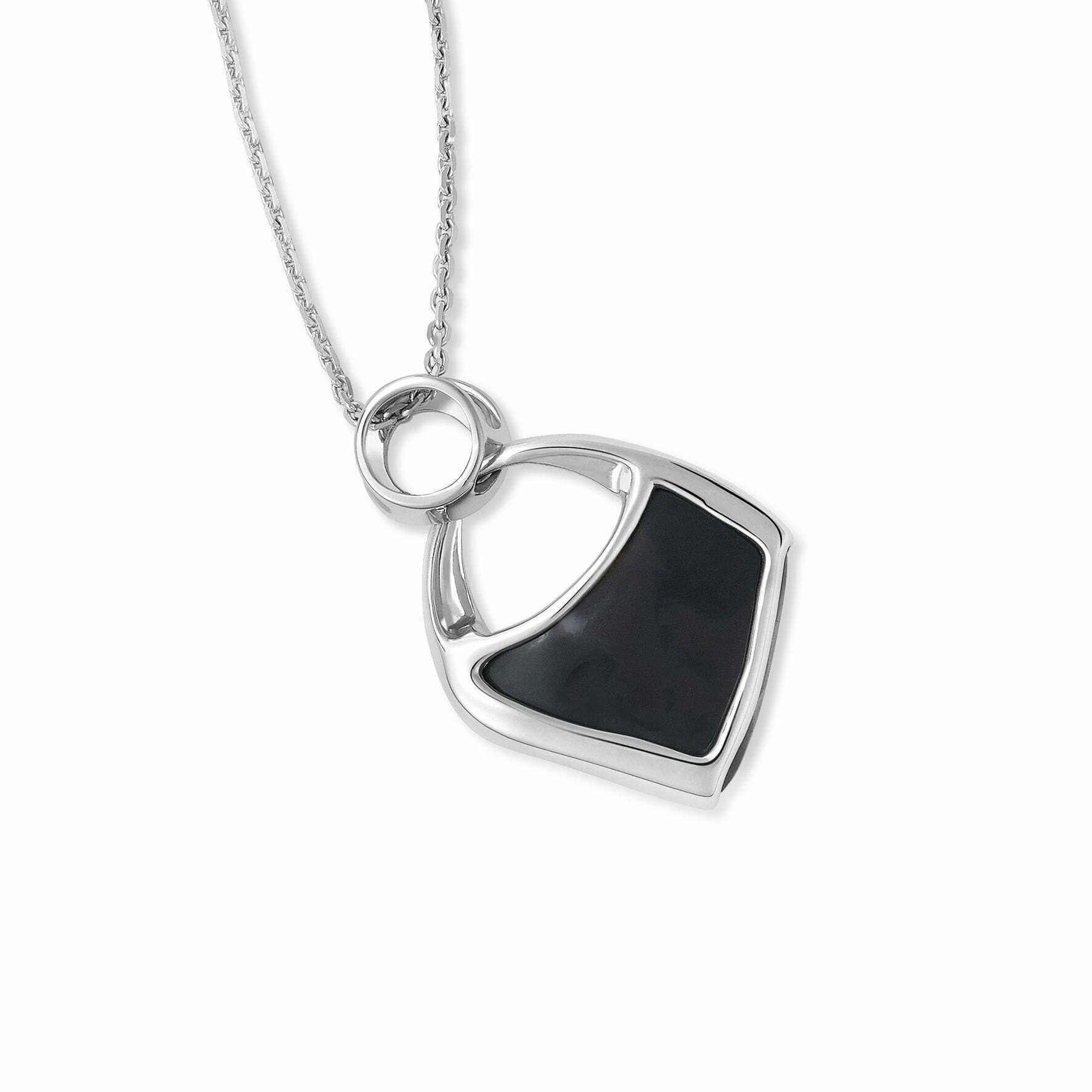 This pendant features a natural solid black opal from Lightning Ridge, NSW in a semi bezel setting. The top of the pendant has pave diamond accents, and an articulated bail accommodating a 18ct white gold trace chain.