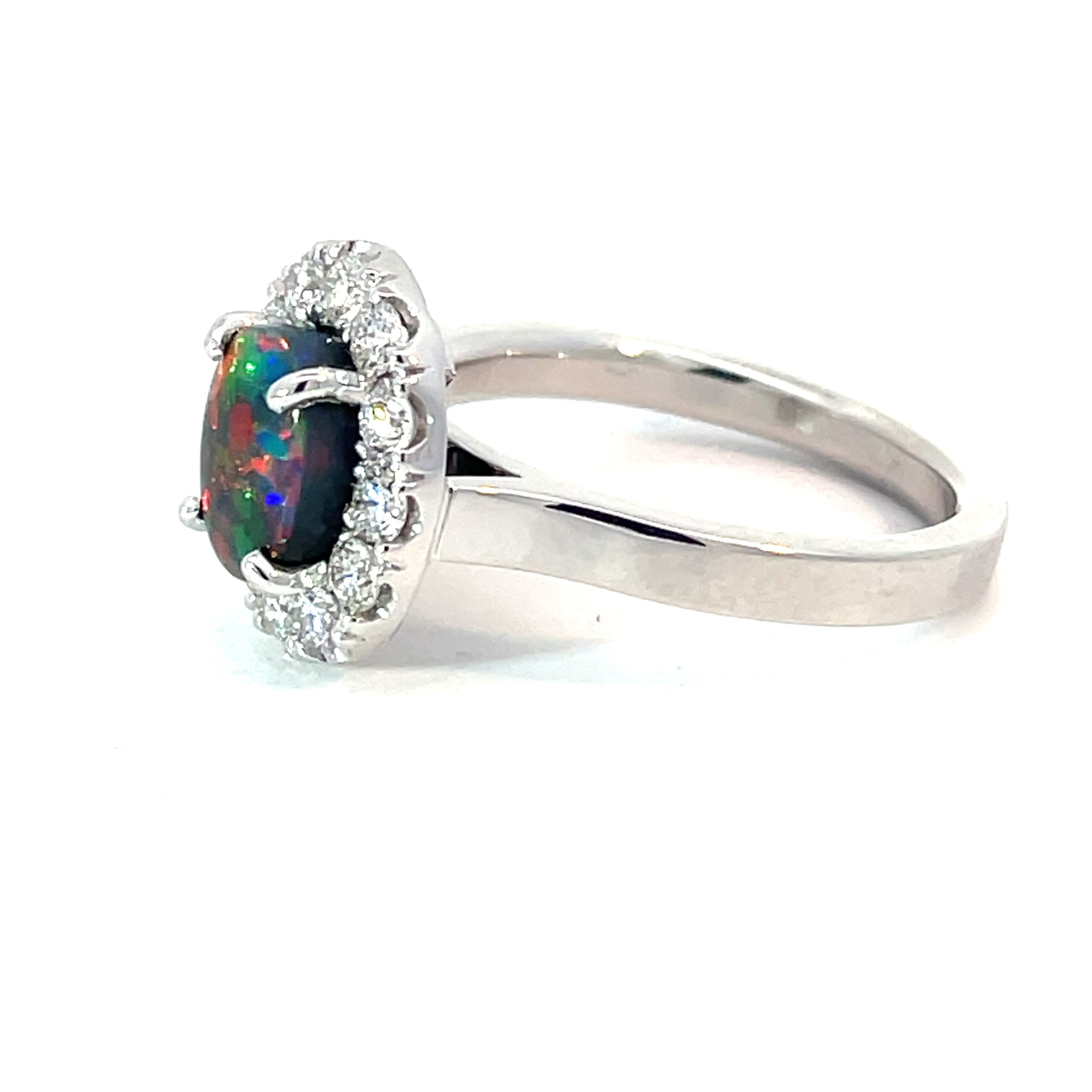 Featuring a solid Lightning Ridge Black Opal with a striking red and green pinfire pattern. The opal is claw set and surrounded by a halo of cut claw set white diamonds. This classic setting is supported with a flat upswept band with an under-rail.