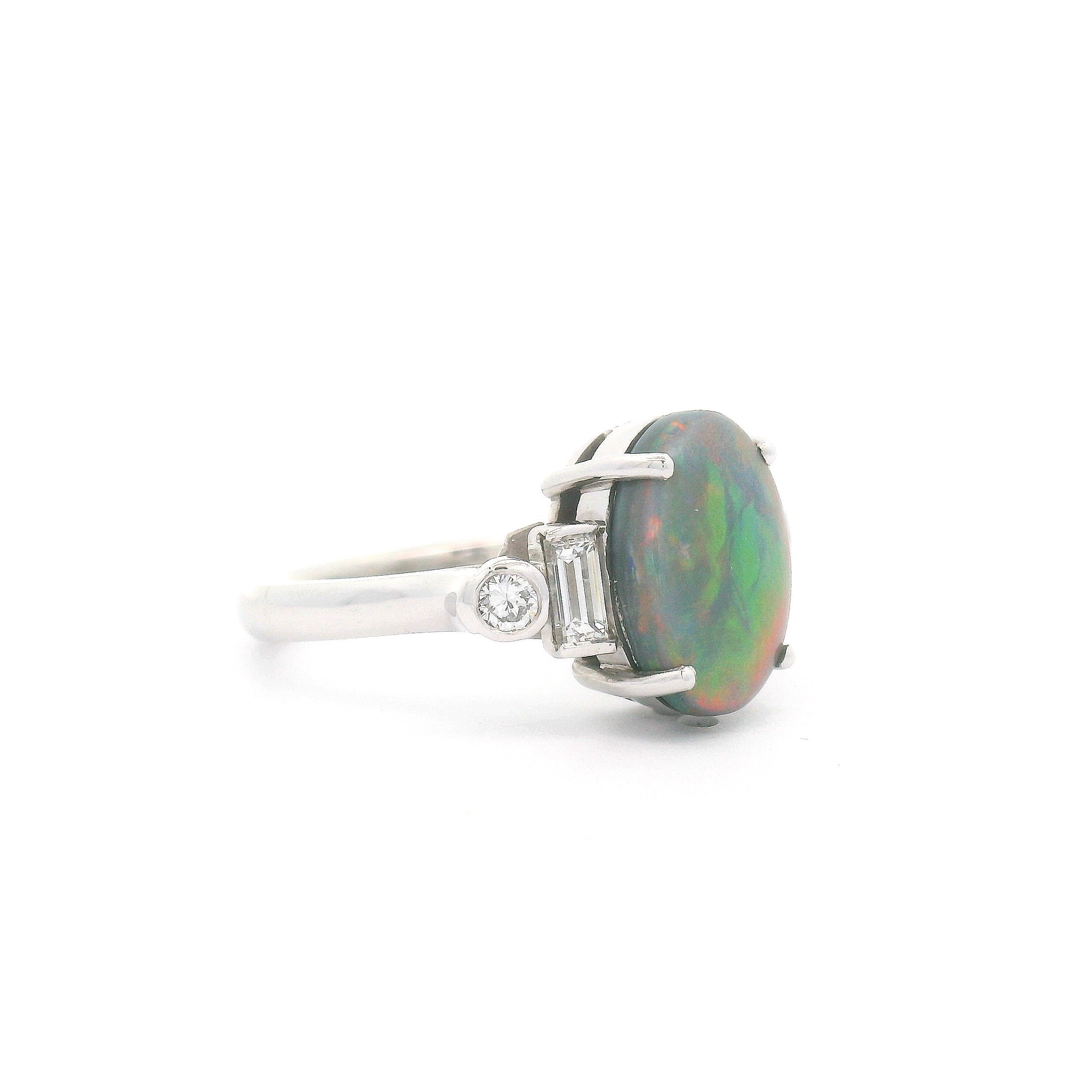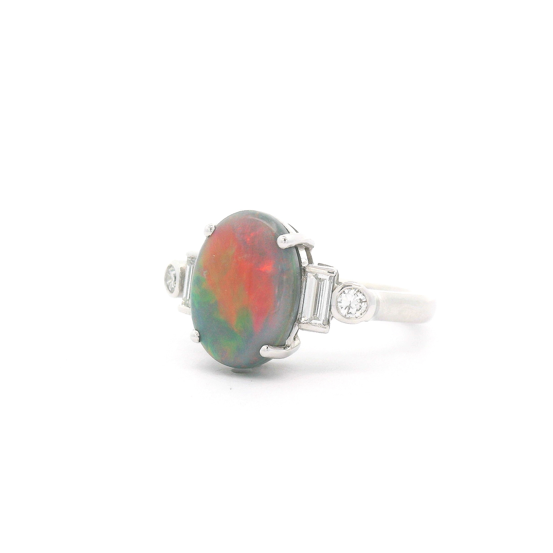 Featuring a solid Lightning Ridge Black Opal with a striking red and green flash pattern. The opal is claw set and flanked by baguette cut and round cut natural white diamonds at the shoulders. This classic setting is supported with a half-round upswept band with an under-rail.